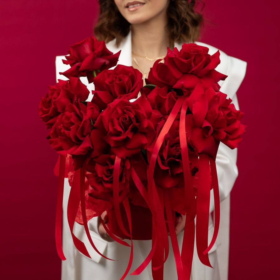 Состав: роза - 9 шт эвкалипт - 4 веток шляпная коробка - S
