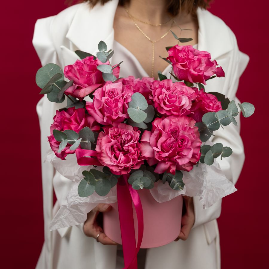 Состав: французская розовая роза - 9 шт кустовая роза мадам бомбастик - 2 шт эвкалипт - 3 ветки шляпная коробка бархат S - 1 шт