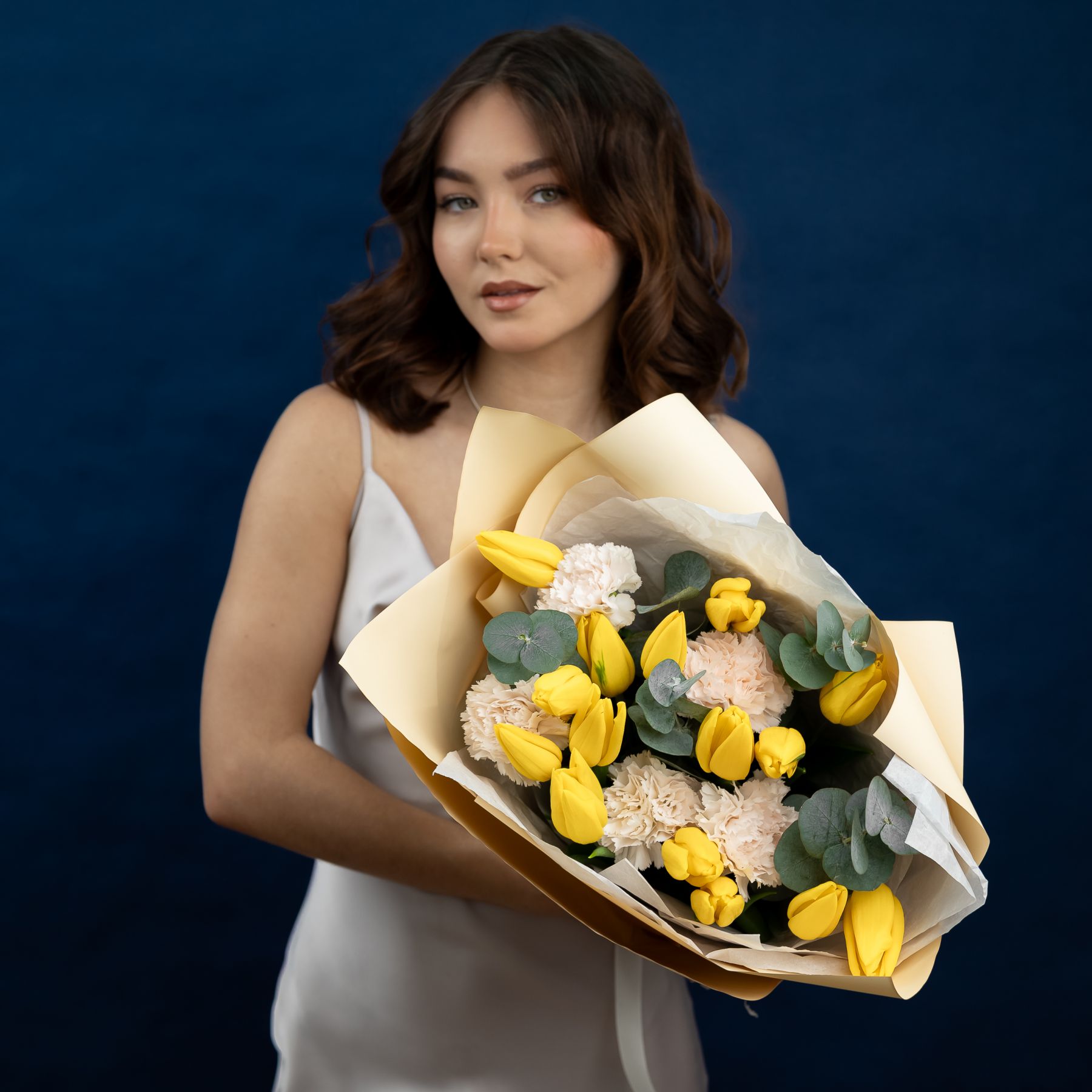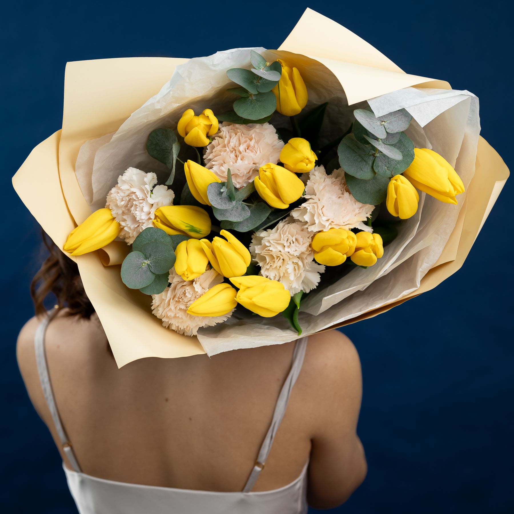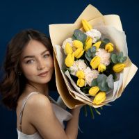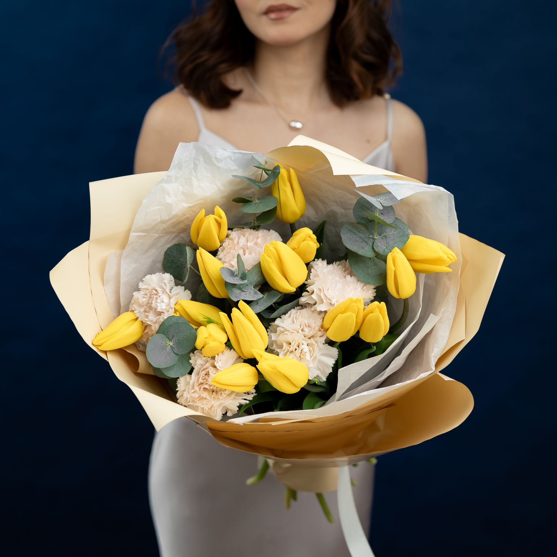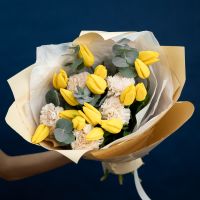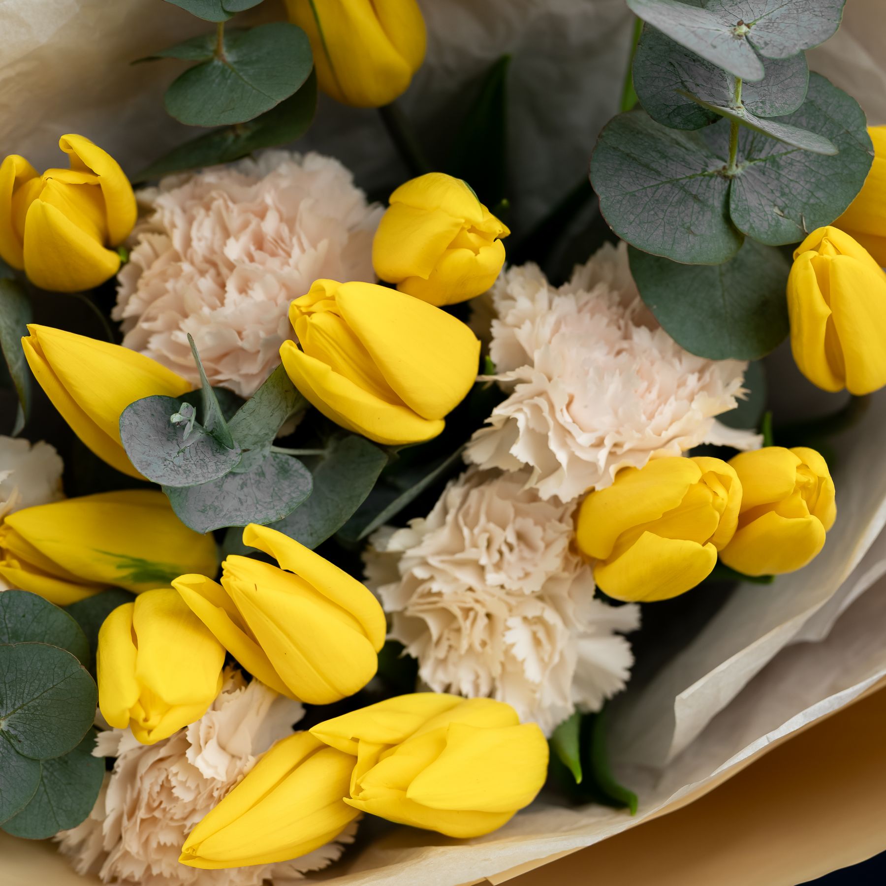 Желтые тюльпаны с диантусами и эвкалиптом